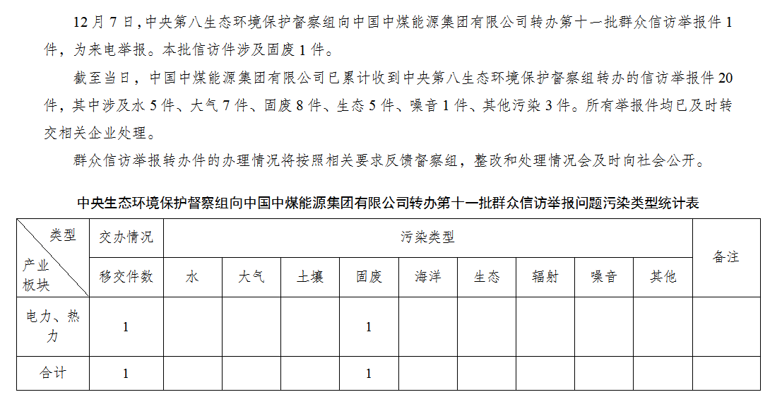 中央第八生態環境保護督察組向中國中煤能源集團有限公司轉辦第十一批群眾信訪舉報件